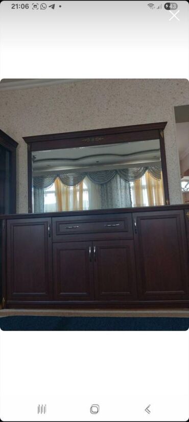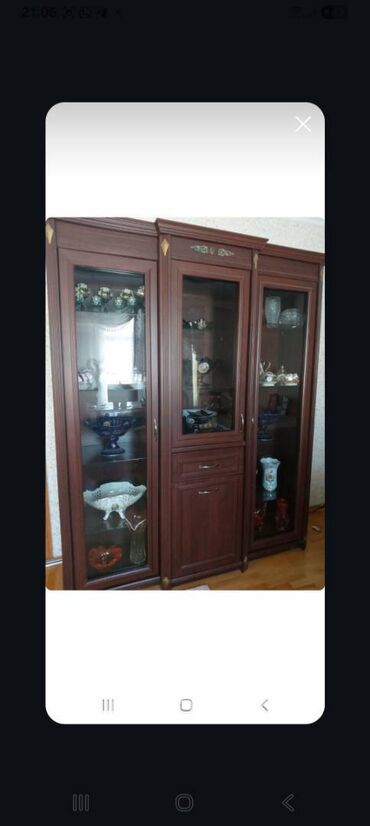 Mebel dəstləri 1) TV stend – ölçü: 180 sm - Üst hissədə uzun rəf və iki ədəd asma şkaf (açıq bölmələr və qapalı dolablar) - Aşağı hissədə geniş tumbalı TV altlığı, 3 qapalı bölmə, dekorativ halqa ...