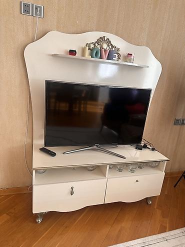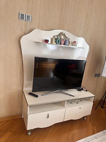 - TV stendi: Eyni dizayn xəttində ağ rəngli parlaq səth, üst hissədə dekor rəfi olan arxa panel. Aşağıda TV üçün geniş masa, iki açıq niş və iki qapaqlı bölmə. Dekorativ tutacaqlar və təkərli ayaqlar sayəsində yeri rahat dəyişir.