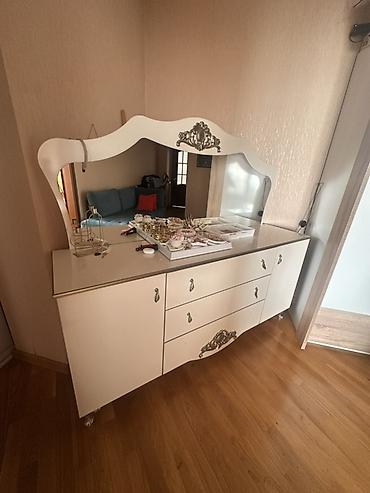 - Konsol güzgü ilə: Ağ rəngli, dalğalı konturlu iri dekorativ güzgü paneli və üzərində gümüşü ornament. Konsol hissəsində 3 ədəd orta çekmece, iki yanda qapaqlı bölmələr. Üst səth genişdir, aksesuar və dekor üçün uyğundur. Dekorativ tutacaqlar və xrom rəngli təkər ayaqlar.