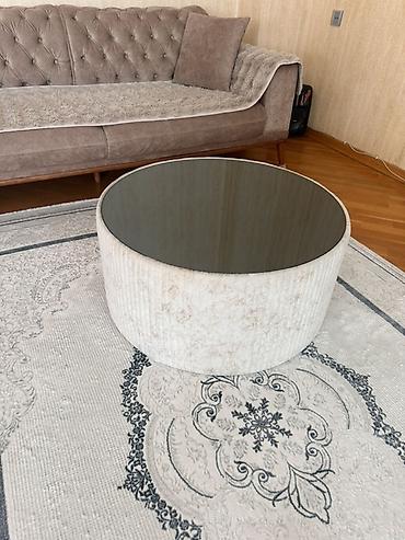 - Dairəvi jurnal masası: Silindrik forma, dairəvi şüşə üst. Korpusda teksturalı naxış, neytral açıq tonlar; qonaq otağına uyğun kompakt ölçü.