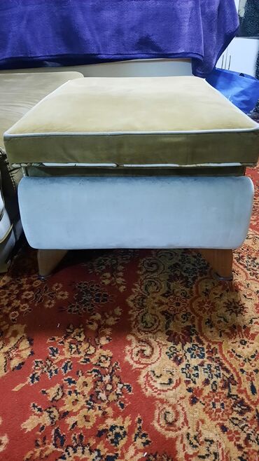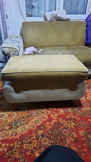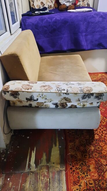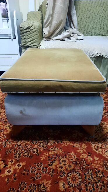 - Dizayn: Sağ tərəfdə çiçək naxışlı qol dayağı, bədən hissəsi isə zeytuni rəngli yumşaq parçadandır. Aşağı baza açıq boz rəngdədir, taxta dayaqlar üzərində durur.