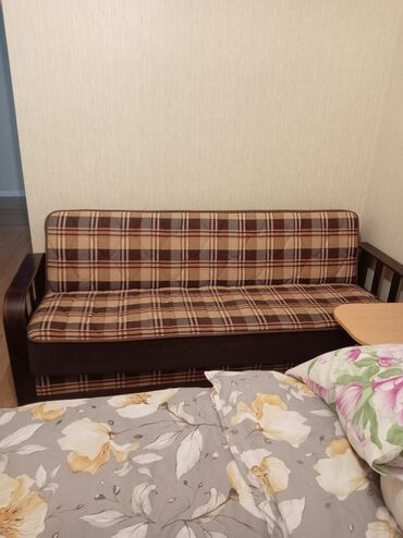 Kompakt divan – taxta yanlıqlar və dama naxışlı parça