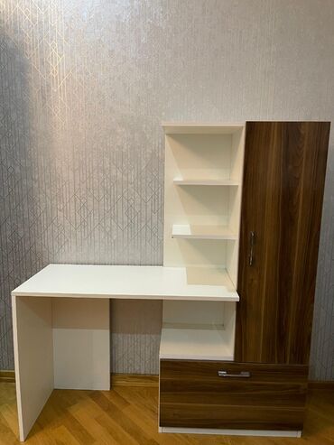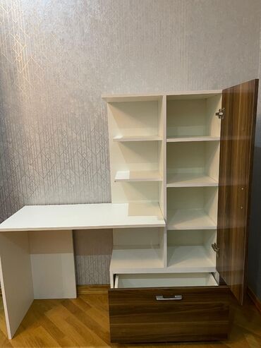 - Funksional dizayn: solda geniş iş/oxu masası, sağda açıq rəflər və qapılı şkaf kombinasiyası.