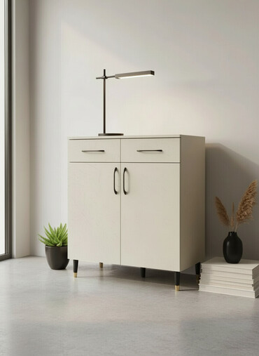 Ağ rəngli, müasir üslubda hazırlanmış bu komod evinizə zərif bir görünüş verəcək. Geniş yuxarı səthi dekorativ əşyalar üçün idealdır. Sol tərəfində iki siyirtmə və aşağıda bir qapısı var, sağ tərəf...