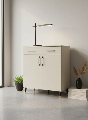 Mebel: Geniş konsol/komod - Dizayn: Horizontal lamel effekti olan ön panel, iki mərkəzi şaquli xəttlə vurğulanmış modern üslub. Parlaq krem (ivory) rəngli korpus, alt hissədə tünd qəhvəyi baza. - ...