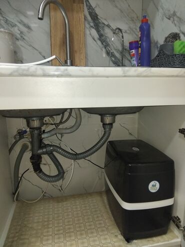 Mətbəx lavabosunun altına quraşdırılan kompakrt su təmizləmə sistemi (Reverse Osmosis). Şəkillərdə müxtəlif modellər göstərilib, hamısı kabinet içində yer tutmadan işləmək üçün nəzərdə tutulub.