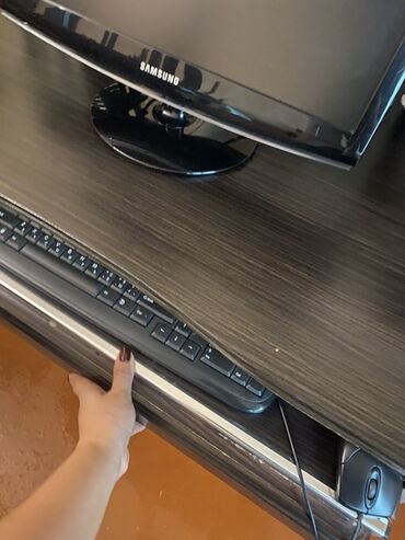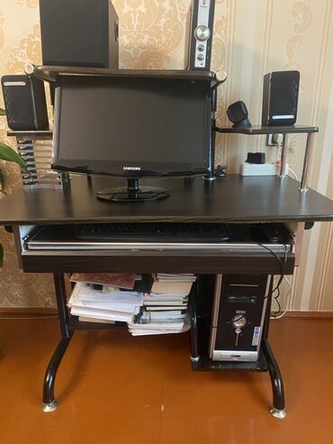 Qara kompüter/iş masası -Qara rəng - Üst səth: geniş iş sahəsi, sol tərəfdə kabel üçün dairəvi keçid dəliyi - Klaviatura üçün sürgülü rəf (alt hissədə) -Kilid yeri olan çəkməcə - Metal tutacaqlar...