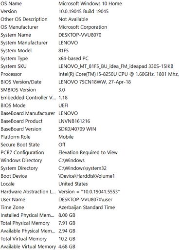 İntel Core i3 -7020U CPU 2.30 GHz RAM 4.0 GB (Artırıla bilir)