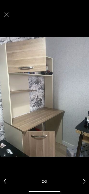 Kompyuter/iş masası – üst dolablı model - Rənglər: tünd qəhvəyi və açıq bej, xrom rəngli tutacaqlar - Material: laminat/LDSP tipli taxta panel - Üst hissə: iki qapalı dolab (yan‑yan) – sənədlər, d...