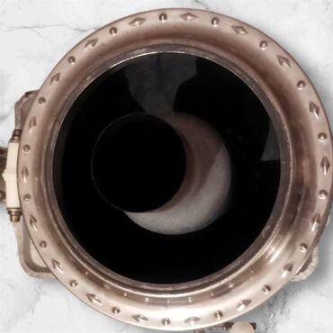 Klassik kömürlə işləyən samovar - Material: parlaq metal korpus (mis/qalay görünüşlü), güclü qulp və dekorativ yan dayaqlar - Yanacaq: kömür və ya odun kömürü ilə işləmə; üst hissədə baca çıxışı v...