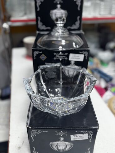 Kəsmə naxışlı şüşə şirniyyat/cem qabı dəsti - Material: qalın, şəffaf şüşə (kristal üslublu kəsmə ornamentlər) - Forma: dalğalı kənar, dərin kasa tipli - Təyinat: şirniyyat, konfet, quru meyvə, qə...