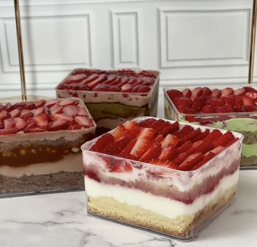 - Çiyələkli laylı desertlər: yüngül krem, vanil biskvit, çiyələk sousu və üzərində təzə çiyələk dilimləri. Müxtəlif dad kombinasiyaları görünür (vanil, şokolad, pista qatları kimi).