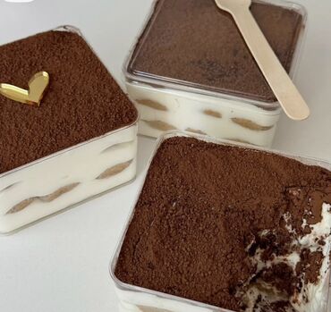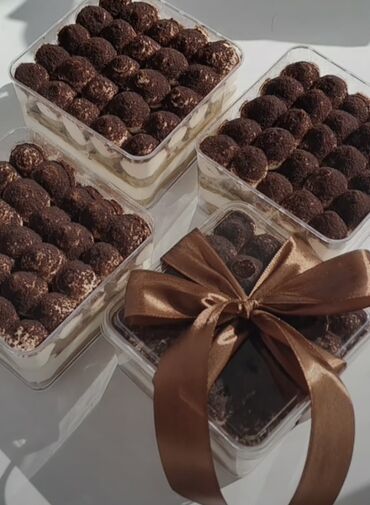 - Klassik tiramisu: kofe ilə isladılmış biskvit qatları, zərif krem və kakao tozu. Bəzi qablar şokolad topları ilə bəzədilib, hədiyyəlik lentlə təqdimat imkanı var.