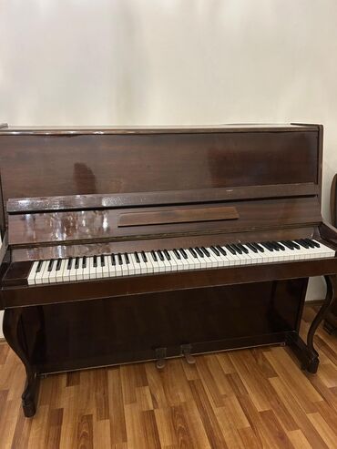 Ölçülər təxmini (şəkillərə əsasən): standart şaquli piano ölçülərinə yaxın; divar boyunca rahat yerləşir.