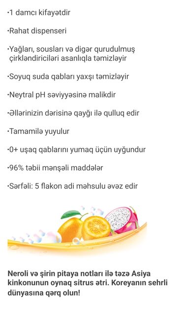 Qabların yuyulması üçün gel-konsentrat istənilən mürəkkəb ləkələrin öhdəsindən gəlir. Uşaq qablarını yumaq üçün istifadə edilə bilər. Parıldayan təravətləndirici ətir verir.