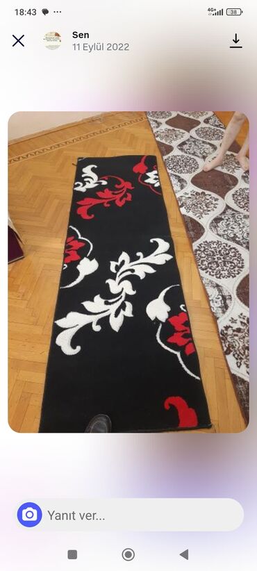 - Model 1: Qara fon üzərində ağ və qırmızı barokko naxışları. Düz kəsimli, kənarları overloklu. Qalın tekstura, yumşaq səth. Qara-ağ-qırmızı kontrastı müasir interyerlər üçün diqqətçəkən aksent yaradır.