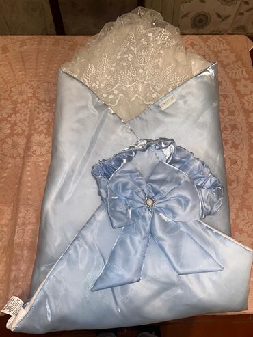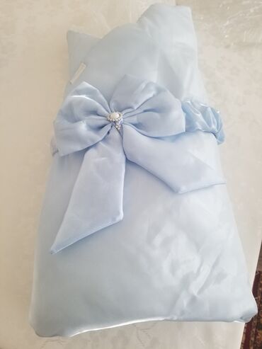YeniZərif dizaynlı körpə bələyəndisi (konvert). Açıq mavi atlas parça, üstündə iri bant və dekorativ qaşlı broş. İç hissəsi yumşaq və komfortlu, baş tərəfi ağ krujeva ilə işlənib. Sarım forması “konvert” tipli olub, körpəni rahat şəkildə bələmək və üstünü örtmək üçün nəzərdə tutulub. Yeni doğulanlar üçün uyğundur; çıxarılan bant sayəsində daha möhkəm sarınma imkanı yaradır. Zərif görünüşü ilə xəstəxanadan çıxış, fotosessiya və xüsusi günlər üçün ideal aksessuar. Rəng: açıq mavi. Materyal: atlas parça + krujeva astar.