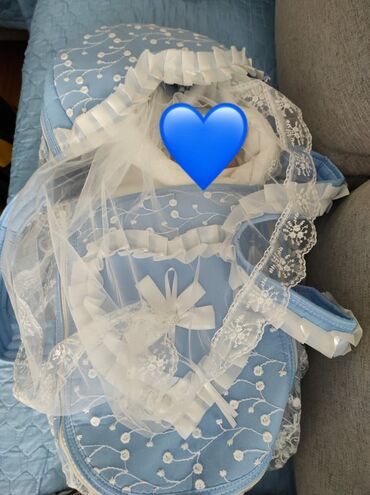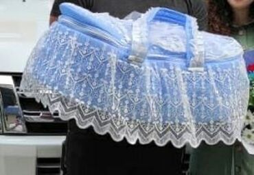 1dəfə istifadə olunub Mavi rəngli, zərif naxışlı tül və krujeva elementləri ilə bəzədilmiş körpə daşıma səbəti.