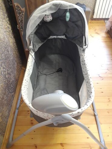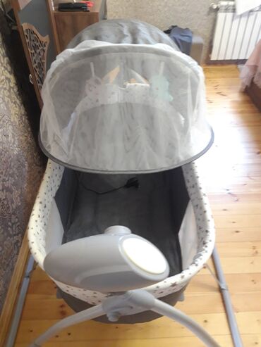 Uşaqlar üçün ulduz naxışlı, boz rəngli yelləncək və beşik. Bu model uşağın rahatlığını təmin etmək üçün nəzərdə tutulmuşdur. Yelləncəyin üzərindəki tor ağcaqanadlardan qorunmağa kömək edir. Beşik uzaqdan idarəetmə pultu ilə idarə olunur və uşağın sakitləşməsi üçün musiqi çalma funksiyasına malikdir. Yelləncək yumşaq oyuncaqlarla təchiz olunmuşdur, bu da uşağın əyləncəsini təmin edir. Məhsul asan daşınma və yığcam saxlama üçün qatlanır.Az istifade olunun usaq yatmadi deye satram,rial aliciya endirim olar.