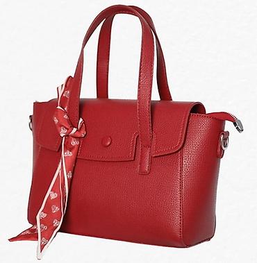 Qadın əl çantası - Rənglər: qırmızı, boz, qara - Material: teksturalı ekodəri; ön hissədə xırda toxuma naxışlı panel - Dizayn: sərt forma, yuxarıda iki ədəd bərkidilmiş sap; ön hissədə dekorativ d...