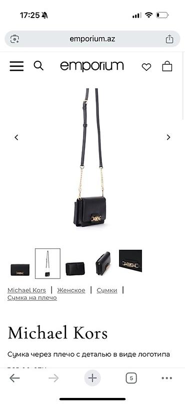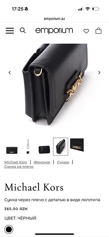 Mənbə görüntüdə göstərildiyi kimi: emporium.az səhifəsində “Michael Kors – Сумка через плечо с деталью в виде логотипа”. Qiymət: 365.00 AZN. Rəng: ЧЕРНЫЙ.