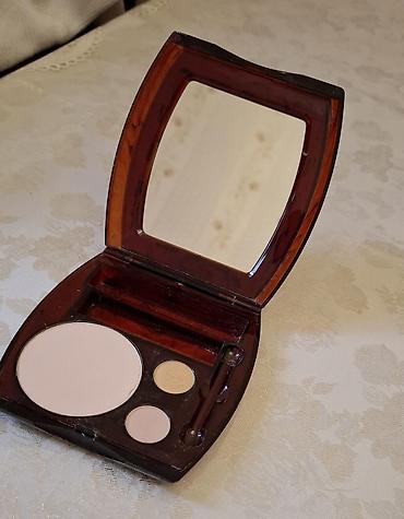 - Kompakt qutu: Tünd-qəhvəyi mərmər naxışlı plastik korpus, qapaqda “ЕЛЕНА” yazısı və “МОСКВА PARIS” qeyd olunub. Maqnitli qapanma tipli kvadrat formaya yaxın dizayn.