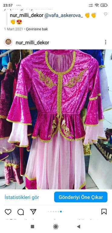 Milli və tematik geyimlər – icarə və səhnə üçün Təsvir: - Azərbaycan milli qadın geyimləri: qırmızı, bənövşəyi, mavi və çəhrayı tonlarda atlas/şifon/qumaşdan hazırlanmış uzun donlar, qızılı naxış ...