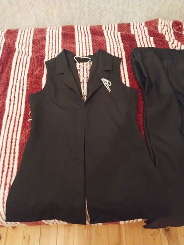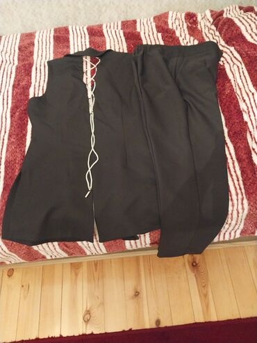 Qadın geyimləri dəsti – ölçü və qiymətlər şəkillərdə göstərilib. - Qara-bej böyük xanalı naxışlı plaş/palto, kapüşonlu, düyməli, yan ciblərlə. Ölçü: 40. Qiymət: 30 manat. - Qara rəngli, ağ xətli k...