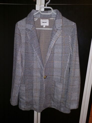 Az Geyinilmis Qadınlar üçün klassik blezer - Brend: NİZE (etiketdə “NIZE” görünür) - Ölçü: 40 - Rəng və naxış: Açıq maviyə çalan boz ton, ağ xətli dama (check) naxış - Model: Düz kəsim, iki düymə...