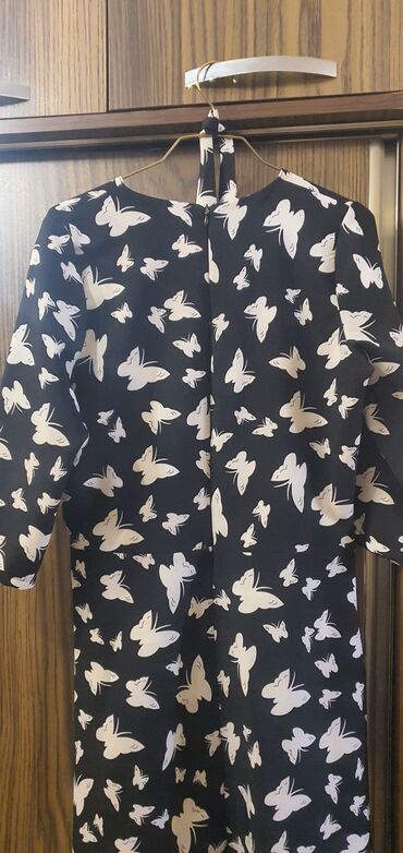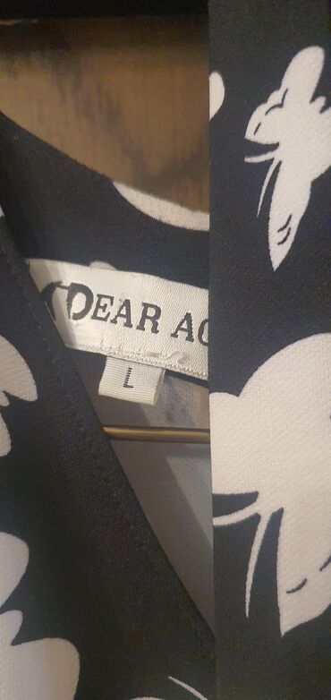 DEAR ACE markalı, qara rəngli, üzərində ağ kəpənək naxışları olan, belindən büzməli və boyun hissəsində bağları olan, qısa qollu don. L ölçüsündədir.