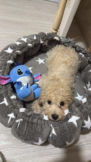 Mini pudel balası - Cins: Poodle (toy/mini tip) - Rəng: Açıq krem/bej - Xüsusiyyətlər: yumşaq, qıvırcıq hipoallergen tüklü, az tökülən; iri qara gözlər və qara burun; balaca ölçü, mənzil üçün ...