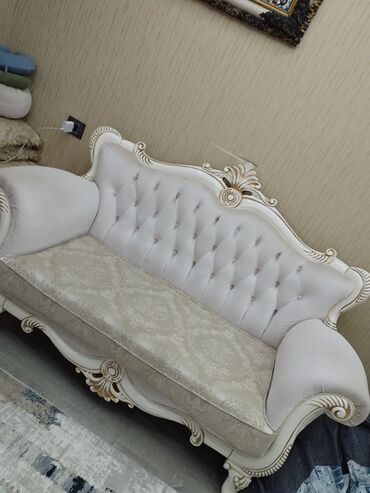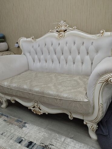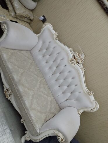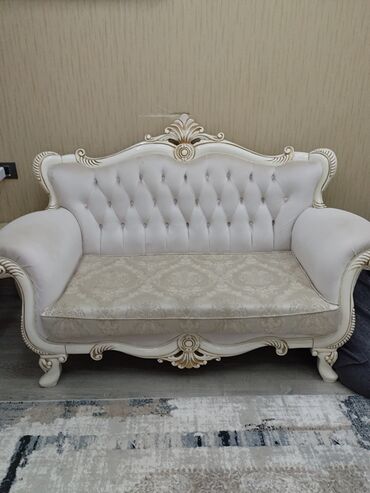 - Dizayn: Kapitone işli bel hissə, oyma dekorlu taxta karkas və ayaqlar, xətli relyef detallar