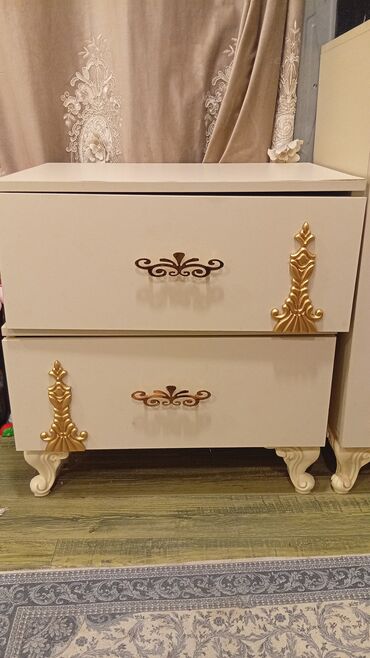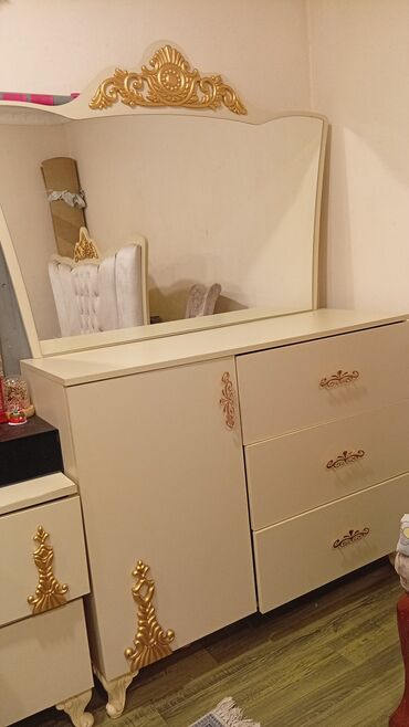 - Komod: sağ tərəfdə 3 çekmece, sol tərəfdə qapalı bölmə; üstündə iri ölçülü dekorativ güzgü (yuxarı hissədə qızılı naxış)