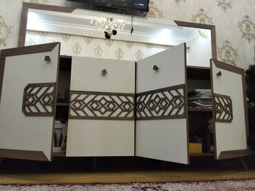 Material: laminasiya olunmuş ağac lövhə/MDF kombinasiyası, qoz teksturalı örtük və krem panel.