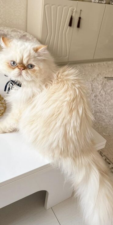 Saf ağ krem rəng çalarında, uzun və qalın tüklü, yastı üz quruluşuna və iri mavi gözlərə malik pişik. Ekzotik/örtülü pers tipli görünüş, qısa pəncələr və tüklü quyruq. Şəkillərdə bantlı/zınqırovlu ...