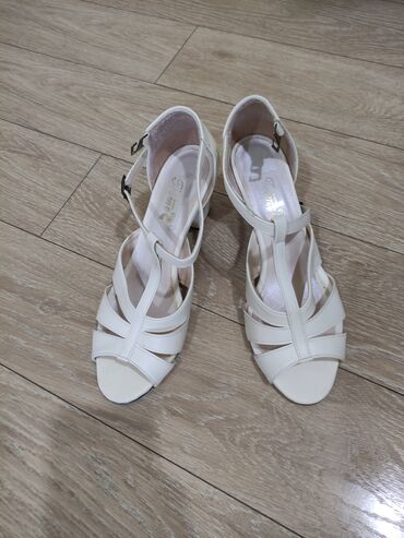 Ağ rəngli, qalın dabanlı qadın sandal modeli. Kvadrat burunlu dizayn