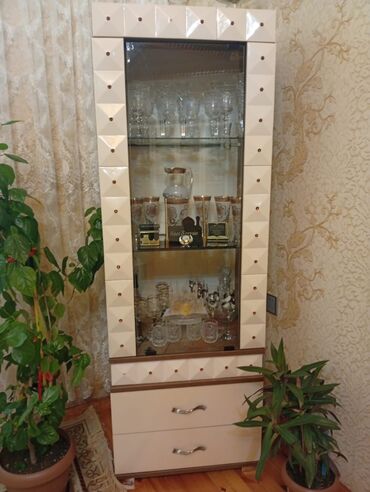 Qonaq otağı mebel dəsti - Vitrin şkafı (ağ): İki qapılı, şüşə önlü, yarpaq naxışlı dekor. Daxildə şüşə rəflər, xrom tutacaqlar, dayanıqlı altlıq. Qədəh, qab-qacaq, bəzək əşyaları üçün geniş vitrin...