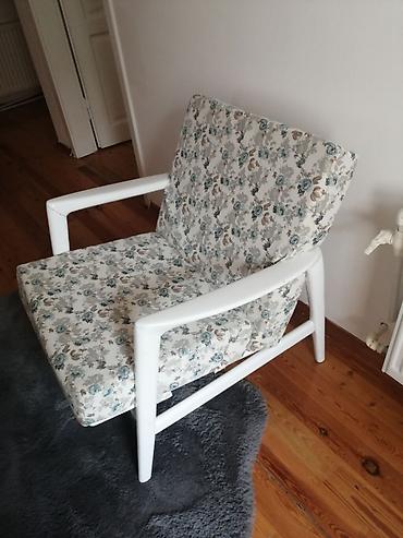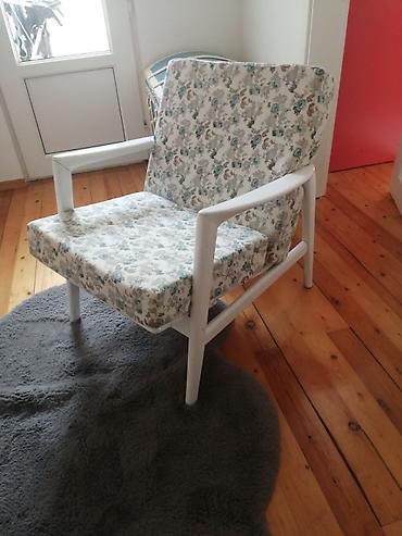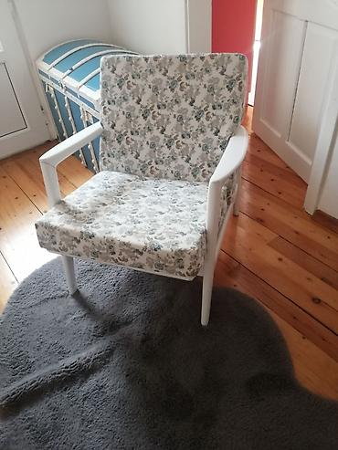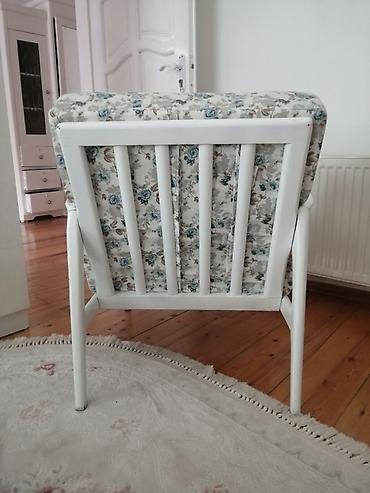 - Üzlük: Krem fon üzərində zərif mavi-boz çalarlı çiçək naxışlı parça. Oturacaq və bel hissəsi eyni parçadan, bir-birini tamamlayan yastıq elementləri ilə.