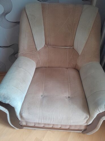 Mebel dəsti - Yumşaq fotel: Boz rəngli, geniş oturacaq və arxalıq yastığı ilə rahat model. Qalın, yumşaq süet/velür tipli parça, enli qol dayaqları, sabit karkas. Müasir minimal dizayn, istirahət ...