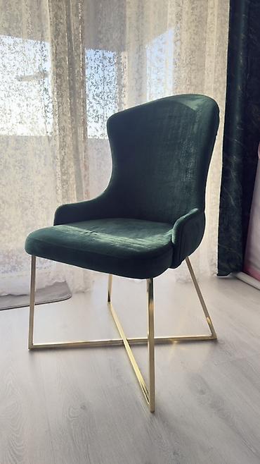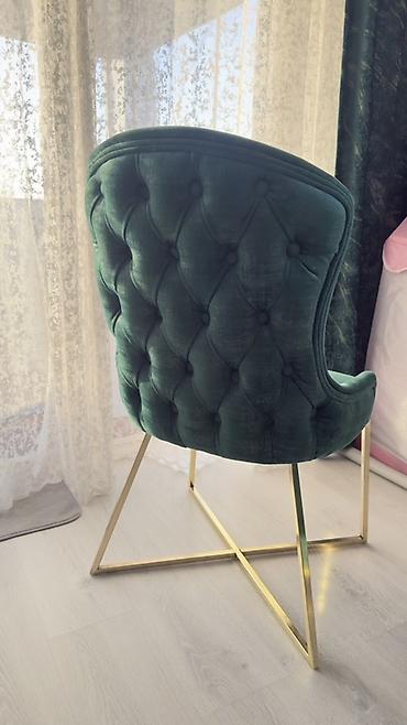 Təsvir: - Müasir dizaynda 4 ədəd yumşaq stul. (1 ədədi 100 azn) - Rəng: yaşıl tonlu parça - Material: toxuma parça (meşkovina) üzlük, taxta ayaqlar (tünd qəhvəyi) - Ergonomik formaya malik bel daya...