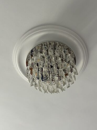 - Dizayn: dairəvi metal əsas və tavan rozeti, çoxqatlı kristal/prizmatik asqılar. Kristallar zəncirvari düzülüşdədir, ucları konusvari kəsimlidir, işığı parlaq şəkildə səpələyir.