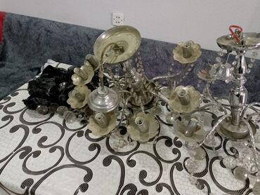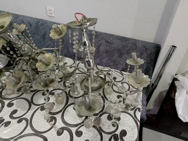 Klassik kristal çilçıraq - Material: metal gövdə (antik gümüş tonunda) və çoxsaylı asma şüşə/kristal bərqavərlər - Dizayn: çoxqollu konstruksiya, hər qolun üzərində dekorativ kasalar və kristal da...