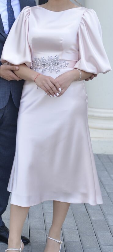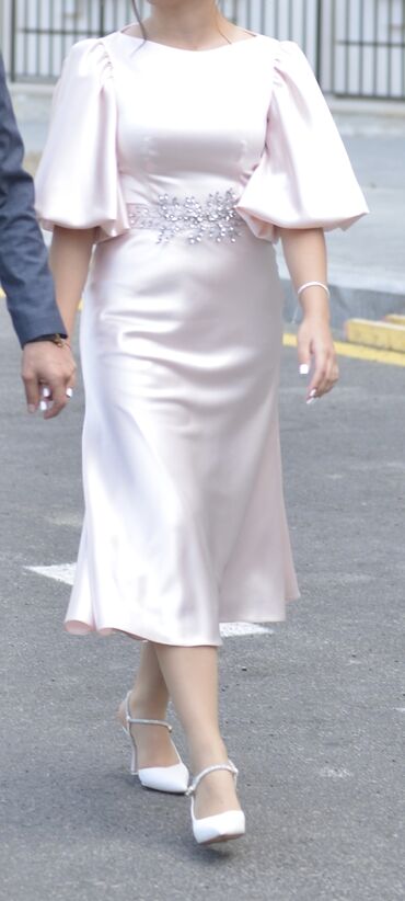 Şampan-çəhrayı rəngdə, atlas parlaqlığında midi ziyafət/libas. (1 dəfə geyinilib. 200 azn tikilib,100 azn satılır.)