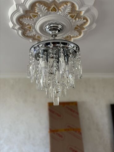 Tavan üçün nəzərdə tutulmuş bu çilçıraq, xrom örtüklü metal gövdəyə və aşağıya doğru sallanan şəffaf kristal elementlərə malikdir. Kristallar işığın yayılmasına kömək edərək, otaqda parıltılı effekt yaradır. Çilçıraq, dekorativ tavan qəlibləri ilə birləşdirilmişdir ki, bu da ona əlavə zəriflik verir. İstənilən məkana dəbdəbəli və parlaq görünüş bəxş etmək üçün ideal seçimdir.təzə alınıb evə uygun gəlmədi deyə satılır 45 manata alınıb 35ə satıkır