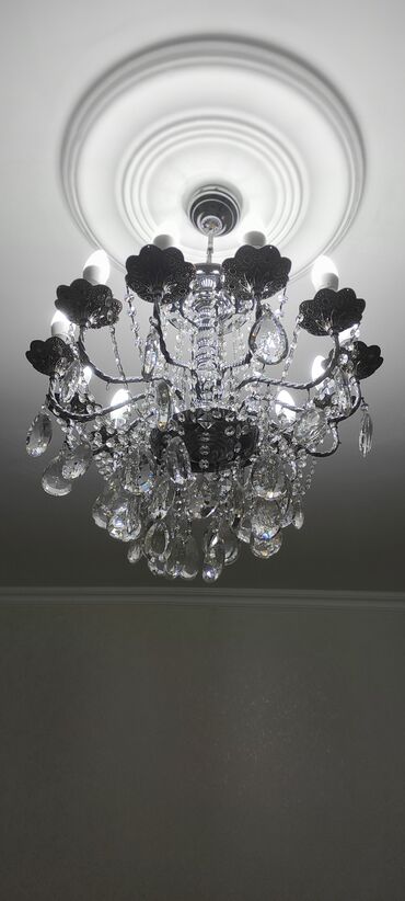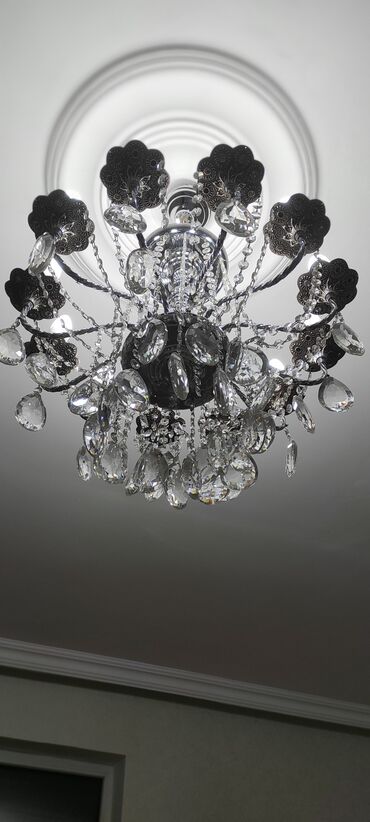 Klassik üslubda, çoxqollu tavan çilçırağı - Material: xrom rəngli metal konstruksiya, şəffaf və tüstü rəngli kristal-bəzəklər (damcı formalı asmalar, zəncirli elementlər). - Qol sayı: 12 qol (şam ...