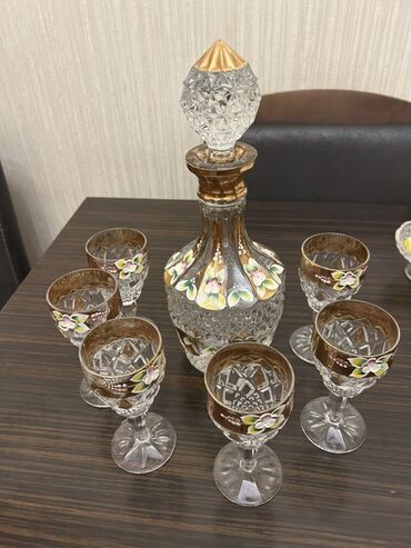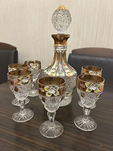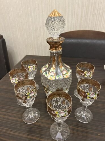 Büllur içki dəsti - Tərkibi: 1 ədəd qrafin və 6 ədəd ayaqlı badə - Material: kəsimli büllur şüşə - Dizayn: üst hissələri qızılı bəzəkli, əl işinə bənzər çiçək naxışları; qrafinin qapağı kristal fo...