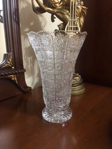 - 1 ədəd hündür kristal vaza (ayaqlı, kəsim ornamentli, dalğalı ağız kənarı)