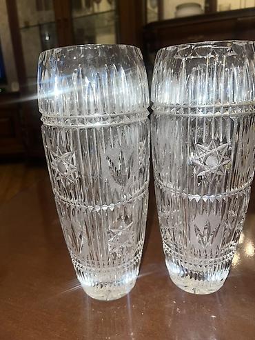 Kolleksiya şüşə və kristal dəsti - 2 ədəd kəpəz uclu, dərin naxışlı kristal vaza. Uzun, çoxüzlü gövdə, parıldayan kəsmə ornamentlər və ziqzaq kənar. - 6 ədəd ayaqlı bokal (şam şərabı/likör üçün). ...