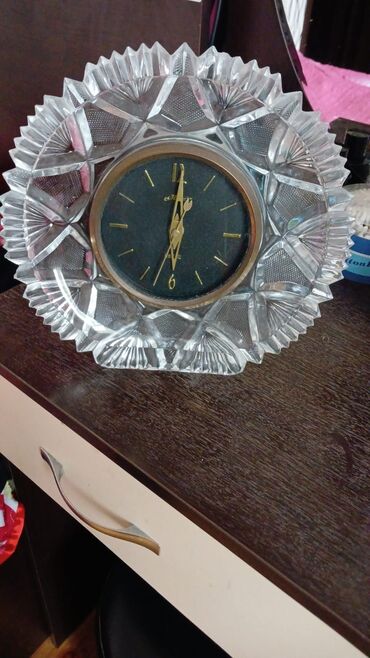 Masaüstü mexaniki saat – “Маяк” (Mayak) markası - Klasik sovet dizaynı - Qara rəngli, qızılı rəqəm və göstəricilər - Korpusu kəpəkli/kristal üslubunda şəffaf çərçivə ilə bəzədilib - Metal dayaq və...