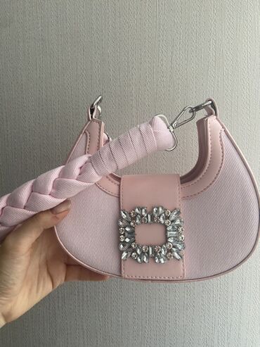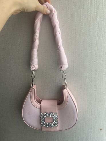 Məhsul: Çiyin çantası - Rəng: Açıq çəhrayı - Material: Parça və süni dəri kombinasiyası - Dizayn: Kiçik “baguette”/aypara forması, ön hissədə iri parlaq daşlarla bəzədilmiş dekorativ düzbucaqlı br...